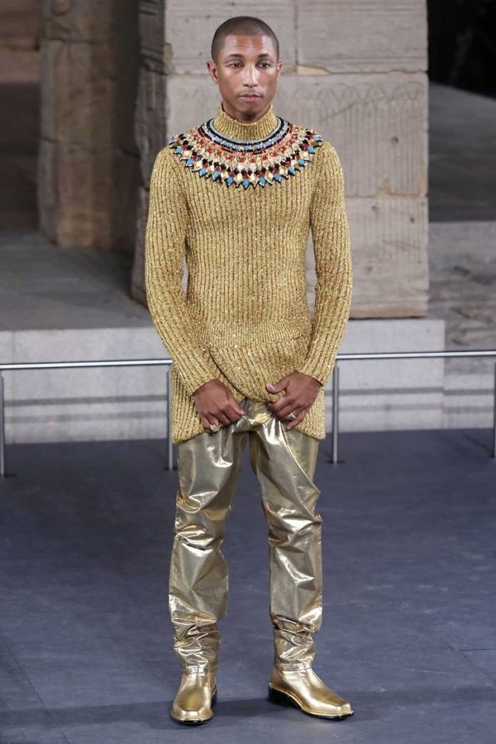Highlights of the 17th annual Métiers d’Art show include extravagantly lush silhouettes and gorgeous neck ornaments. Each piece is informed by an Egyptian aesthetic that, historically, was only accessible to the wealthy. The high profile event saw over 1,000 special guests. One of which, singer/songwriter Pharrell Williams, was seen modeling a lengthy golden knit sweater, metallic trousers, matching shoes, and an intricate neck piece that, without a doubt, caught the attention of guests.