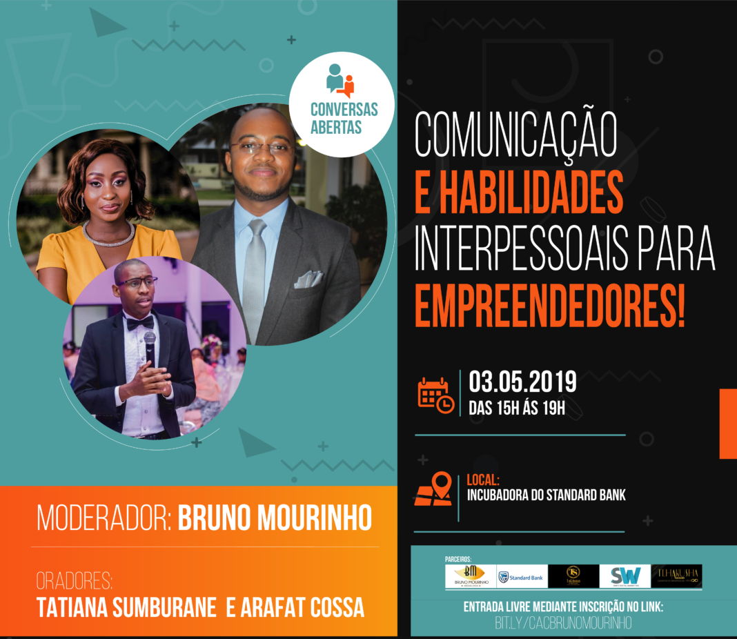 Arafat Cossa and Tatiana Sumburane, accompanied by the moderator and project coordinator, Bruno Mourinho, intend to offer you a unique experience based upon your experiences and skills, on how you can be an effective communicator as an entrepreneur. They will also share tips on how to improve your interpersonal skills for your  personal and professional development.