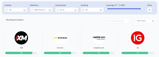 The company’s state-of-the-art filtering engine allows users to select brokers based on the following criteria: license (by country), platforms (offered trading software), instruments (type of tradable assets), funding (available methods for depositing and withdrawing), and leverage (a slider that allows users to choose between the minimum and maximum available leverage). In order to assist those new to the trading industry, the company settled on using a regulating country rather than a specific governing body to make the user experience more straightforward when selecting a license.